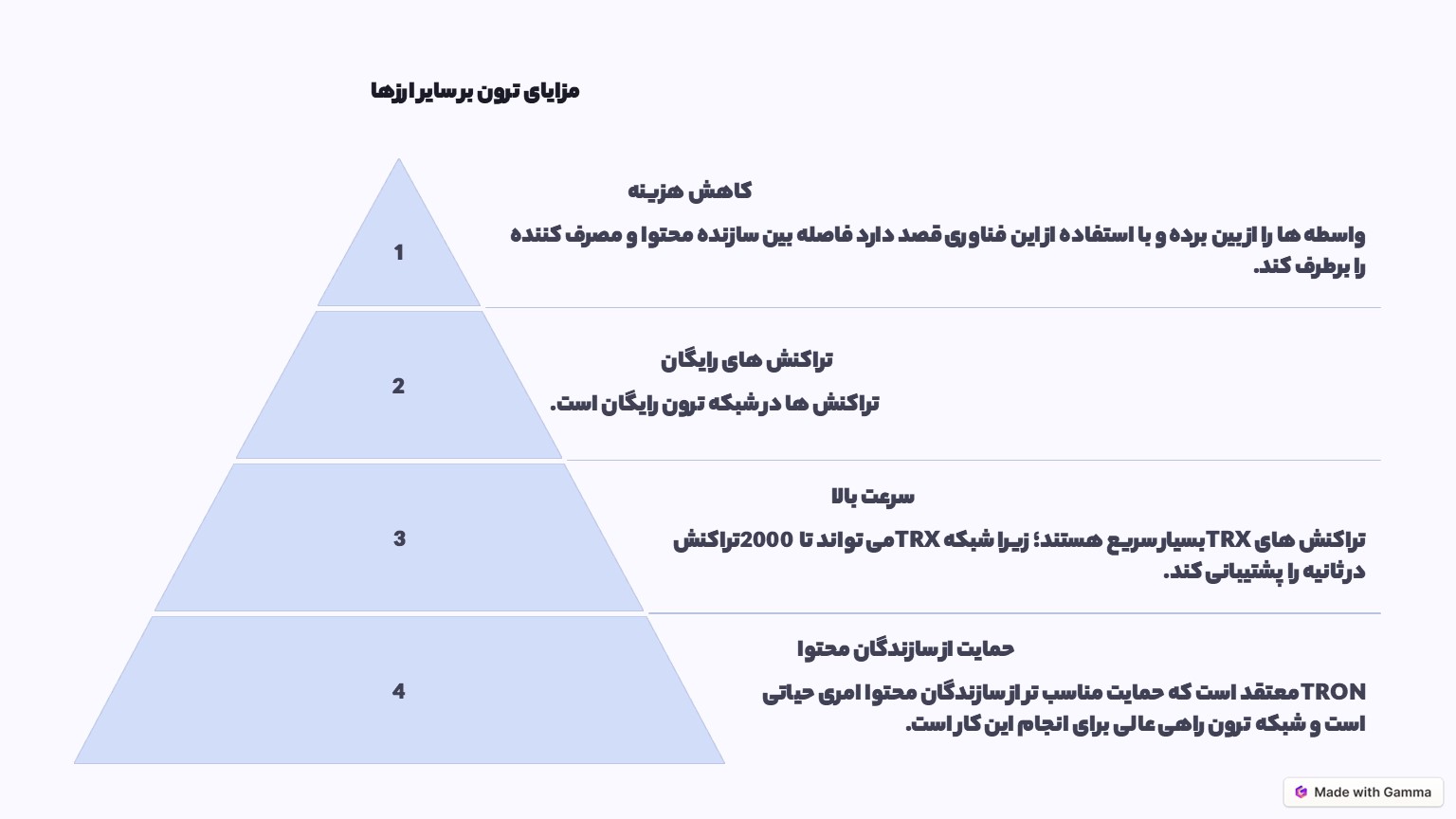 | مزایای ترون | حذف واسطهها، حمایت از تولیدکنندگان محتوا، هزینه صفر تراکنش، سرعت بالا |